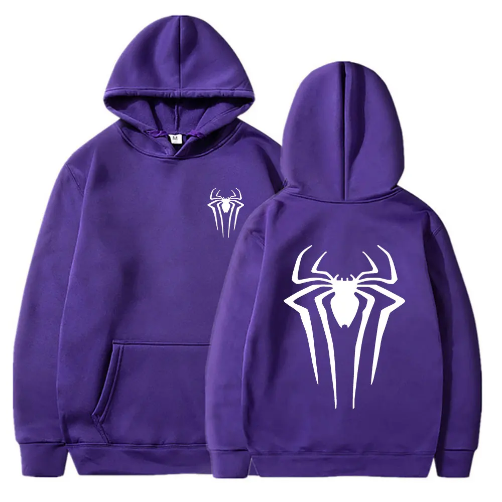 The purple spider hoodie represents a casual garment made as a pullover and sweatshirt that includes a hoodie and a front pocket. Hoodies function as suitable garments for keeping oneself warm during cold days as well as serving to create a stylish and comfortable layered outfit. People can use this hoodie primarily for casual everyday attire and relaxing and physical outdoor activities.